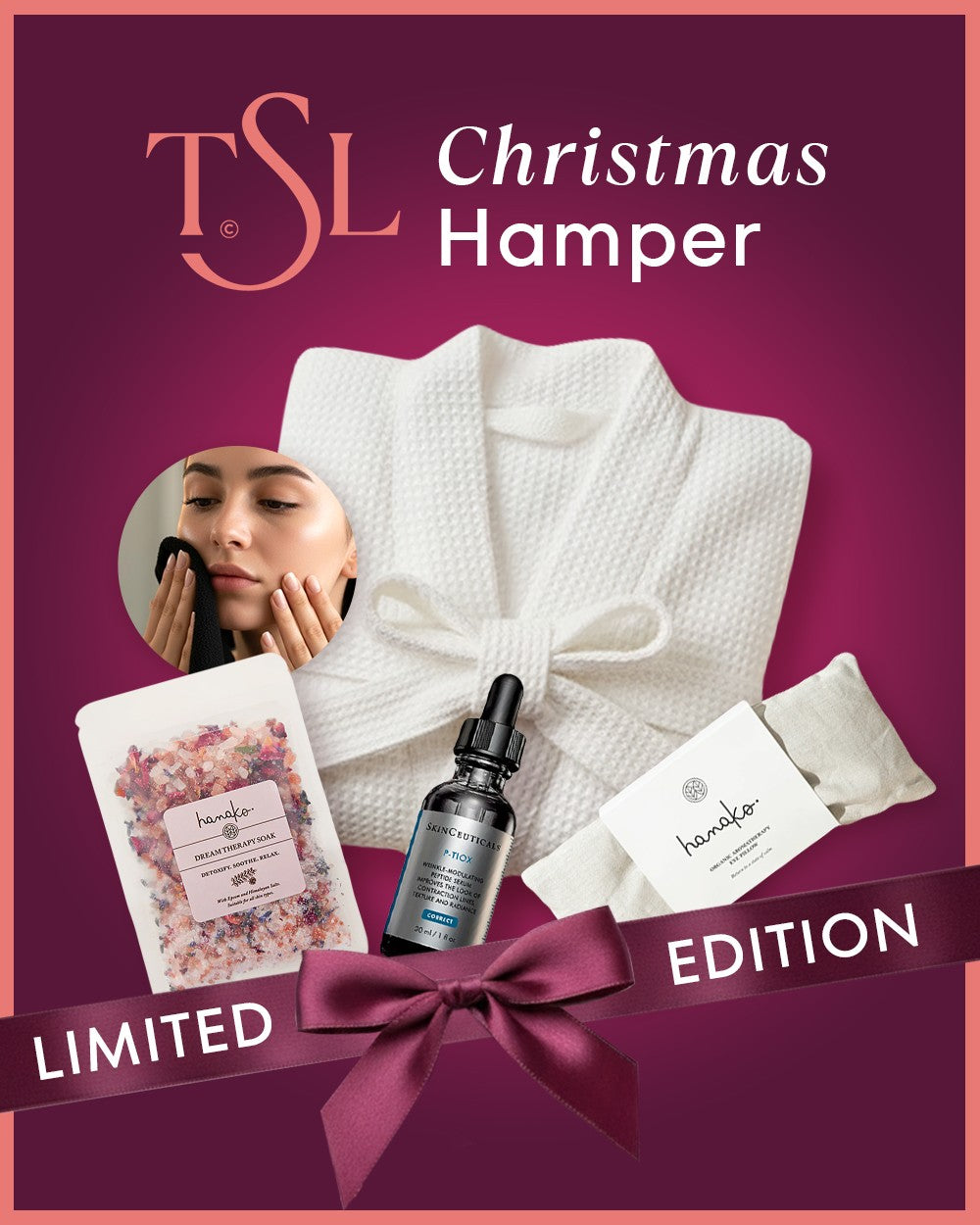For those seeking Christmas skincare gift sets that go beyond traditional skincare and offer a complete sensory experience, the TSL Christmas Hamper is the perfect choice. Inside, you’ll discover the same plush signature robe, a soothing Hanako Salt Soak for ultimate relaxation, a calming eye pillow to unwind the senses, and a coveted SkinCeuticals P-TIOX Peptide serum that delivers a radiant, healthy glow. Every element has been selected to create a moment of self-care, wellness, and indulgence, all wrapped and ready for gifting. This hamper offers exceptional value and sophistication, perfect for anyone who appreciates luxury skincare and festive pampering.